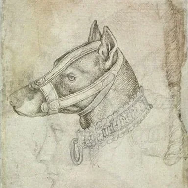 The morphology depicted - moderate cranial breadth, a functional (non exaggerated) muzzle, erect ears (cropped), and overall athletic construction - aligns with descriptions of pre-industrial catch and combat dogs commonly associated with hunting Alaunt-type populations. While the illustration should not be interpreted as a definitive representation of a singular “Alaunt breed”, it provides valuable insight into the range of phenotypes present within broader landrace working dog populations from which later mastiff and bulldog types emerged.